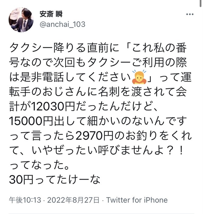 タクシー降りる直前に「これ私の番号なので次回もタクシーご利用の際は是非電話してください🙇」って運転手のおじさんに名刺を渡されて会計が12030円だったんだけど、15000円出して細かいのないんですって言ったら2970円のお釣りをくれて、いやぜったい呼びませんよ?!ってなった。