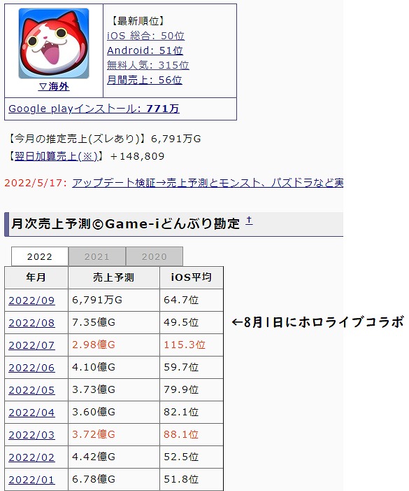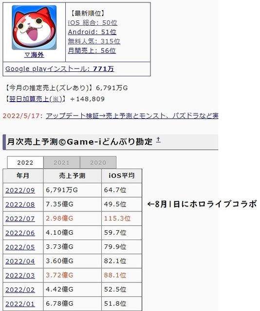妖怪ウォッチぷにぷに。 ホロライブとコラボした8月が3年半ぶりに売上7億超え。前月比2.5倍。