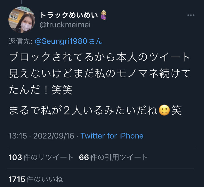これに対して「私のモノマネ、ブロックされている」と言う旨のツイート