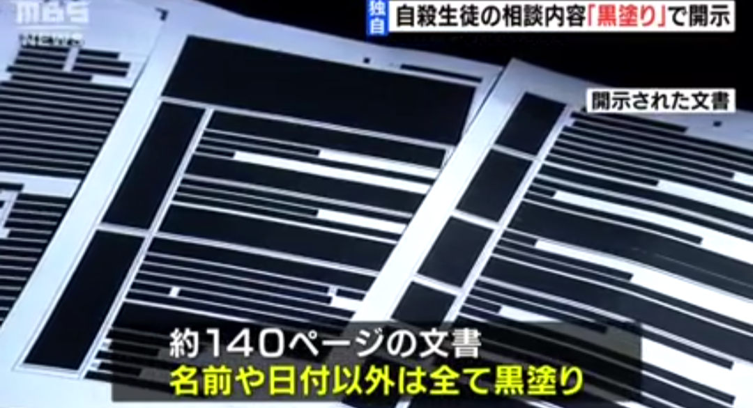 https://news.yahoo.co.jp/articles/42fa4e251b245094169ebc7d13e9a408bed7f806大阪府泉南市の中学1年の男子生徒が自殺した問題。市の教育委員会は、男子生徒が学校に相談した内容を全て黒塗りして遺族に開示していたことがわかりました。