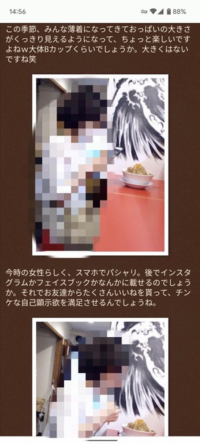 【マジキチ】男さん「あ!ラーメン屋に女が1人で入った!…せや!」 2022/9/17 キニ速 1:それでも動く名無し :2022/09/17(土) 08:33:50.36ID:I0n6NImOM ブログで晒したろ! 4:それでも動く名無し :2022/09/17(土) 08:34:23.09ID:F/ppzlZt0 えぇ… 6:それでも動く名無し :2022/09/17(土) 08:34:48.43ID:ZvBH44zDM 草 8:それでも動く名無し :2022/09/17(土) 08:34:59.83ID:EEGjM+4mp キモ過ぎ 続きを読む Source: キニ速
