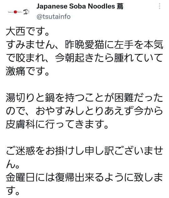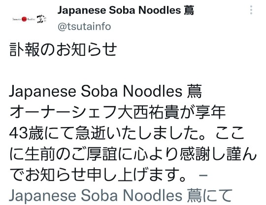 オーナーシェフ大西祐貴が享年43歳にて急逝いたしました。ここに生前のご厚誼に心より感謝し謹んでお知らせ申し上げます。— Japanese Soba Noodles 蔦 (@tsutainfo) September 23, 2022