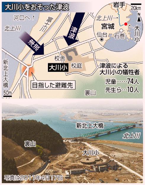学校南側の校庭すぐそばには裏山へ登るための緩やかな傾斜が存在し、児童らにとってシイタケ栽培の学習でなじみ深い場所で、裏山は有力な避難場所であった。