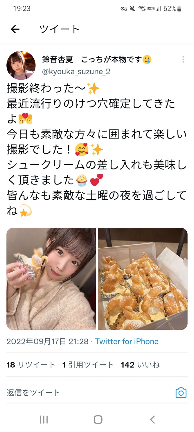 皆んなも素敵な土曜の夜を過ごしてね💫 pic.twitter.com/Kp0cyd2QKd— 鈴音杏夏 こっちが本物です🥲 (@kyouka_suzune_2) September 17, 2022