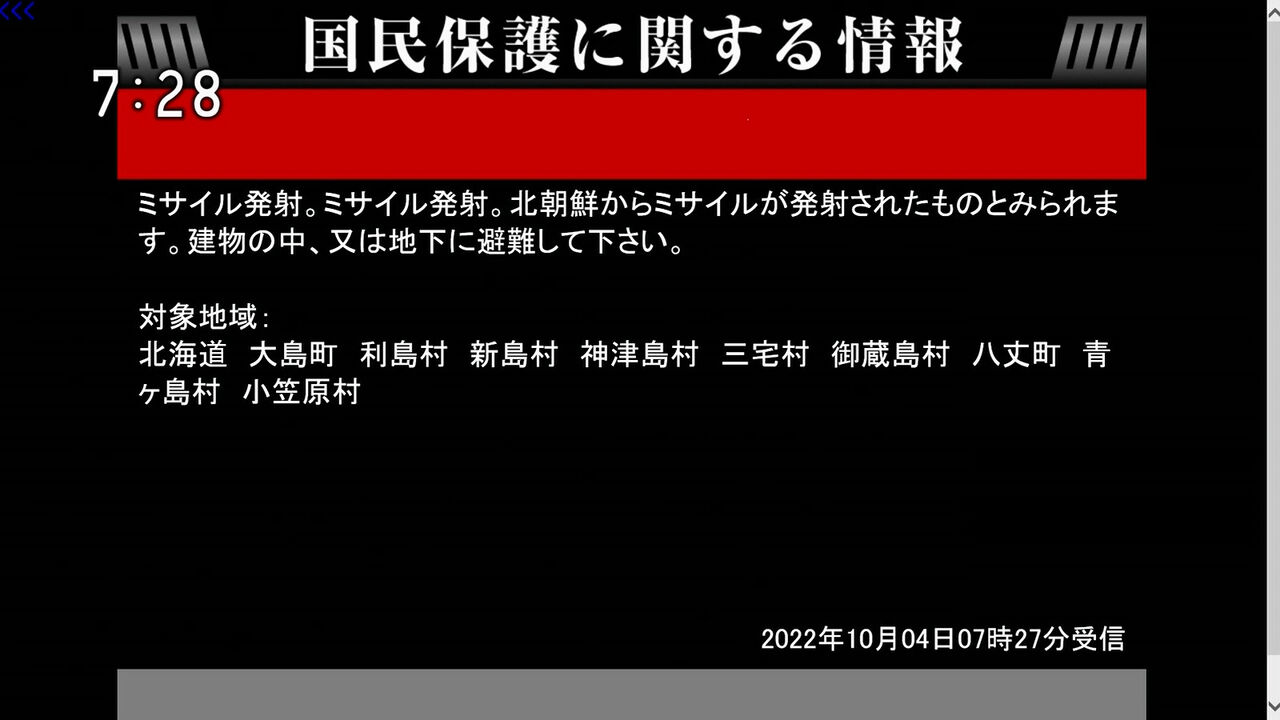 7:27「ミサイル発射!やばい!建物や地下に隠れろ!」