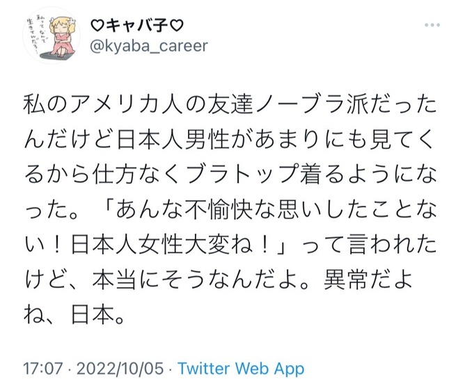 私のアメリカ人の友達ノーブラ派だったんだけど日本人男性があまりにも見てくるから仕方なくブラトップ着るようになった。「あんな不愉快な思いしたことない!日本人女性大変ね!」って言われたけど、本当にそうなんだよ。異常だよね、日本。