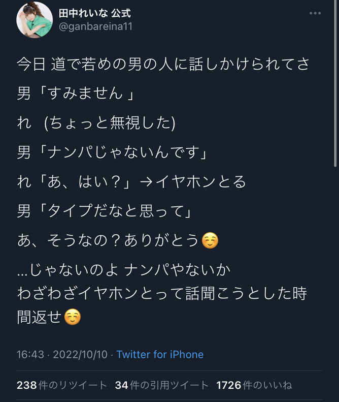わざわざイヤホンとって話聞こうとした時間返せ☺️— 田中れいな 公式 (@ganbareina11) October 10, 2022
