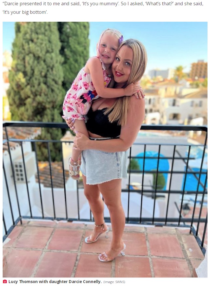 ダーシーちゃんの絵は、2つの大きなボールのような物の上に女性らしき人物がそびえ立っているように見えた。ダーシーちゃんは「これはママを描いたのよ」と説明してくれたが、ピンと来なかったルーシーさんは大きなボールのような物を指差して「これは一体何なの?」と尋ねると、ダーシーちゃんは「ママの大きなお尻よ!」と答えたのだ。