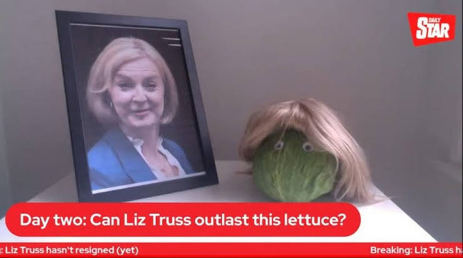 【AFP=時事】リズ・トラス(Liz Truss)英首相の政治生命は、レタスよりも短かった──。英大衆紙が行った両者の「賞味期限」勝負は、トラス氏が20日に辞意を表明したことで、レタスの勝利に終わった。