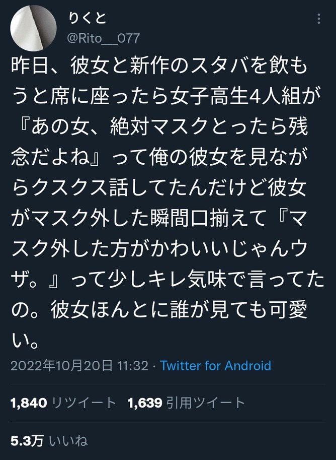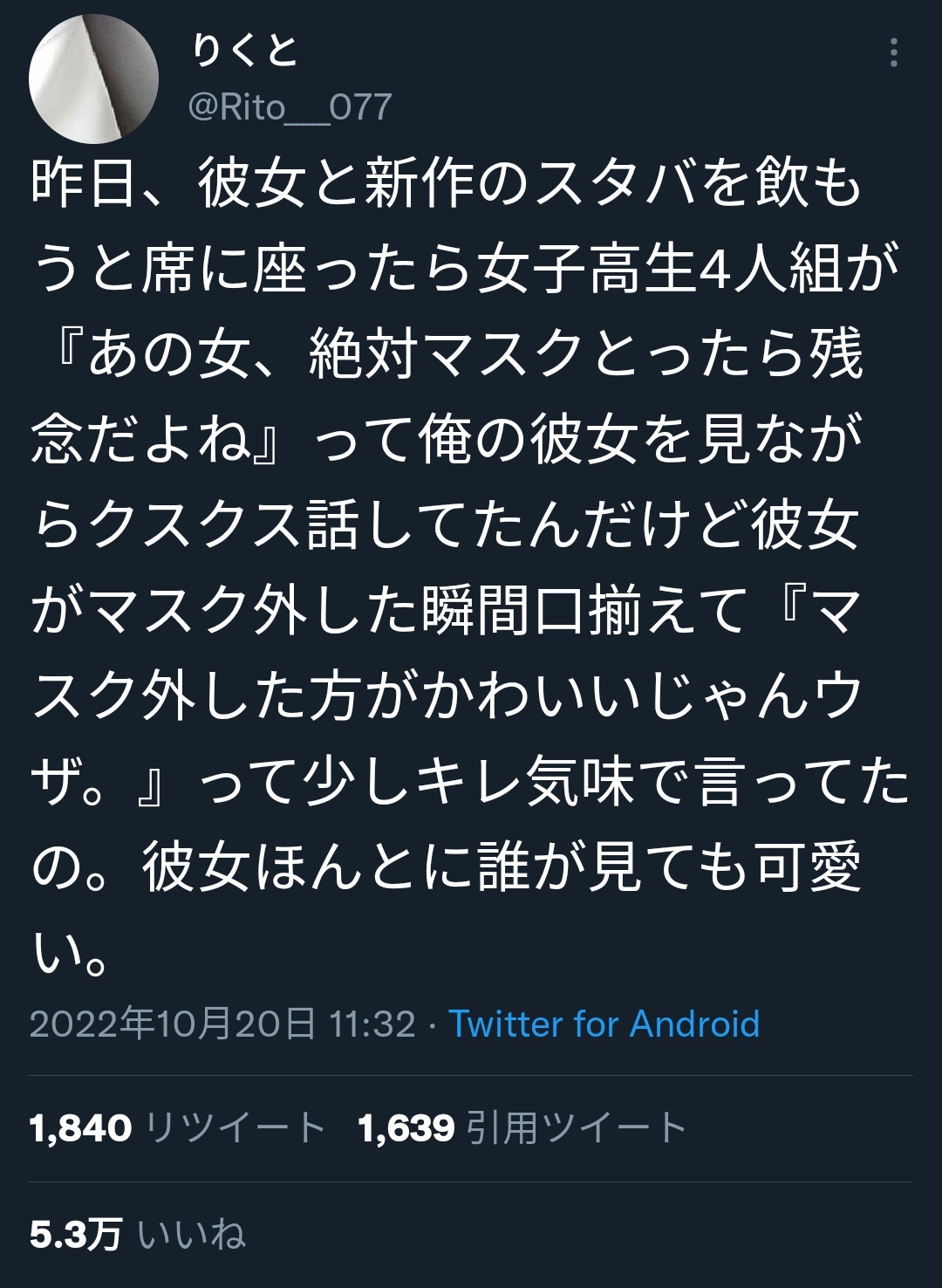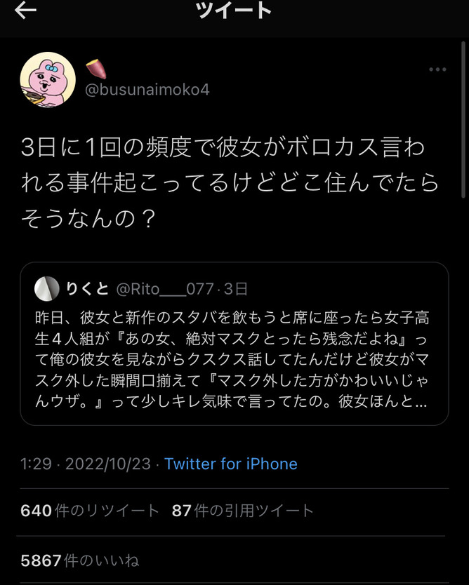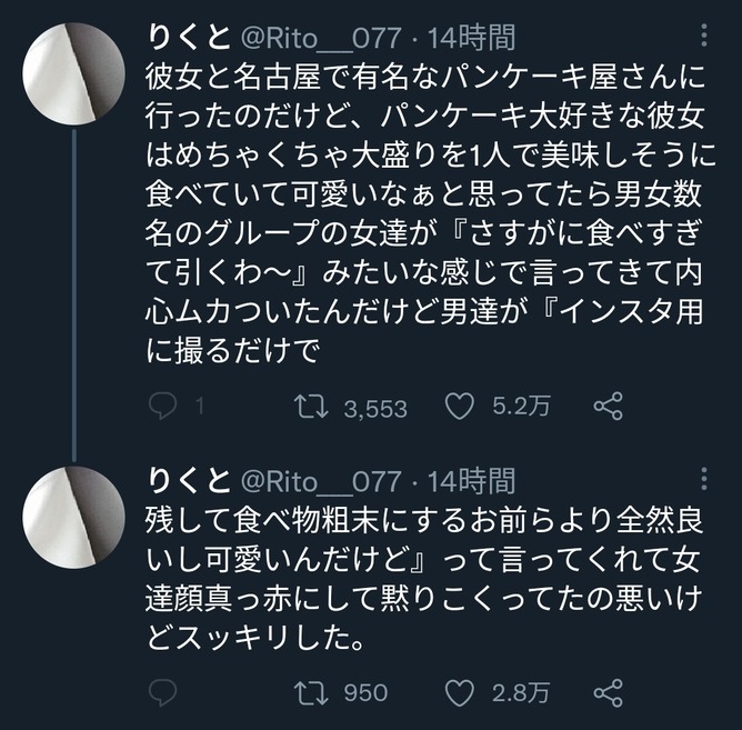 彼女と名古屋で有名なパンケーキ屋さんに行ったのだけど、パンケーキ大好きな彼女はめちゃくちゃ大盛りを1人で美味しそうに食べていて可愛いなぁと思ってたら男女数名のグループの女達が『さすがに食べすぎて引くわ〜』みたいな感じで言ってきて内心ムカついたんだけど男達が『インスタ用に撮るだけで