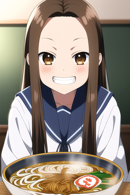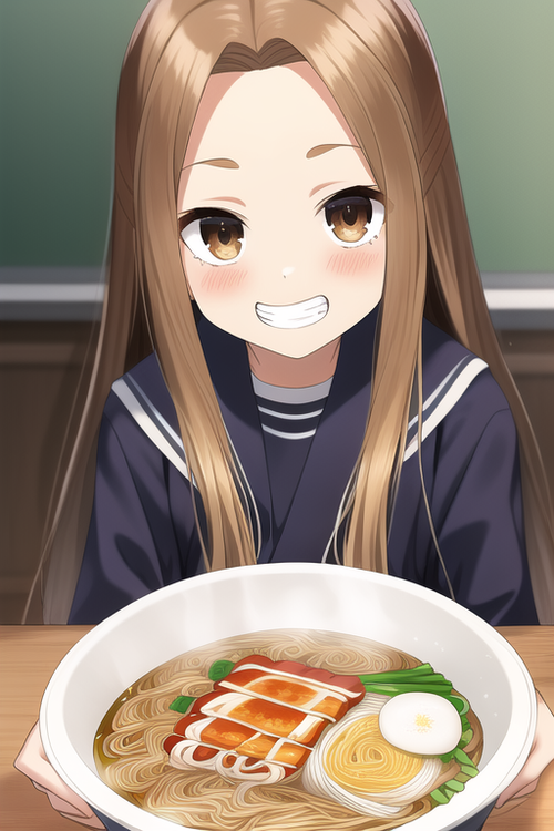 takagisan, 1girl, solo, forehead, light brown hair , long hair, school uniform, sailor uniform, {{{tareme}}}, brown eyes, {{[round eyes}}}, 13 years old,kind smile, round face, karakai jozu no takagisan, yamamoto soichiro, {{{ringed eyes}}}, one length, {{{flat chest}}}, classroom, {{{round face}}}, 5 life size, grin, {{{{{{ramen}}}}}}