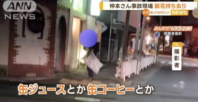 24日深夜に撮影された映像を見ると、袋を持った人物が供えられた花を袋に入れて立ち去りました。
