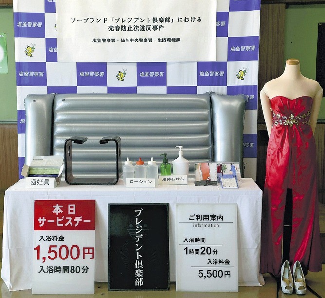 宮城県警は26日、仙台市若林区、会社役員の男(65)、同市青葉区、土木作業員の男(47)を売春防止法違反(場所提供)容疑で逮捕した。会社役員の男は同区のソープランド「プレジデント倶楽部」の経営会社社長で、土木作業員の男は元店長。塩釜署で27日、押収した看板やエアマットなどが報道陣に公開された。