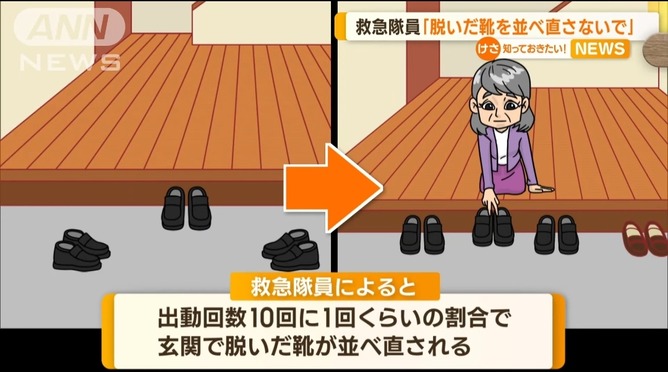 救急隊員によりますと、経験上、出動回数10回に1回くらいの割合で、玄関で脱いだ靴が並べ直されているということです。