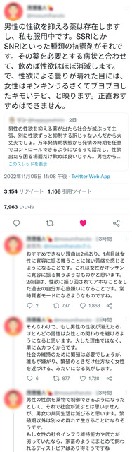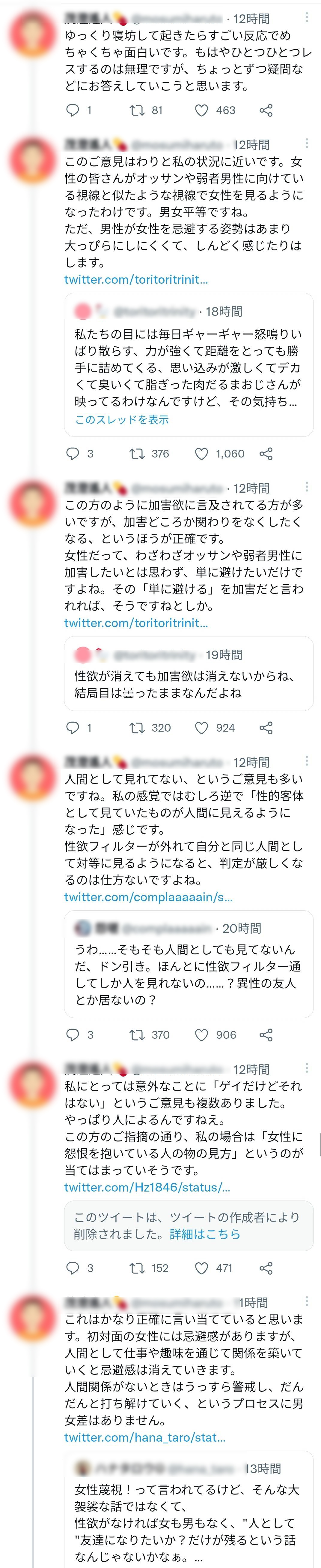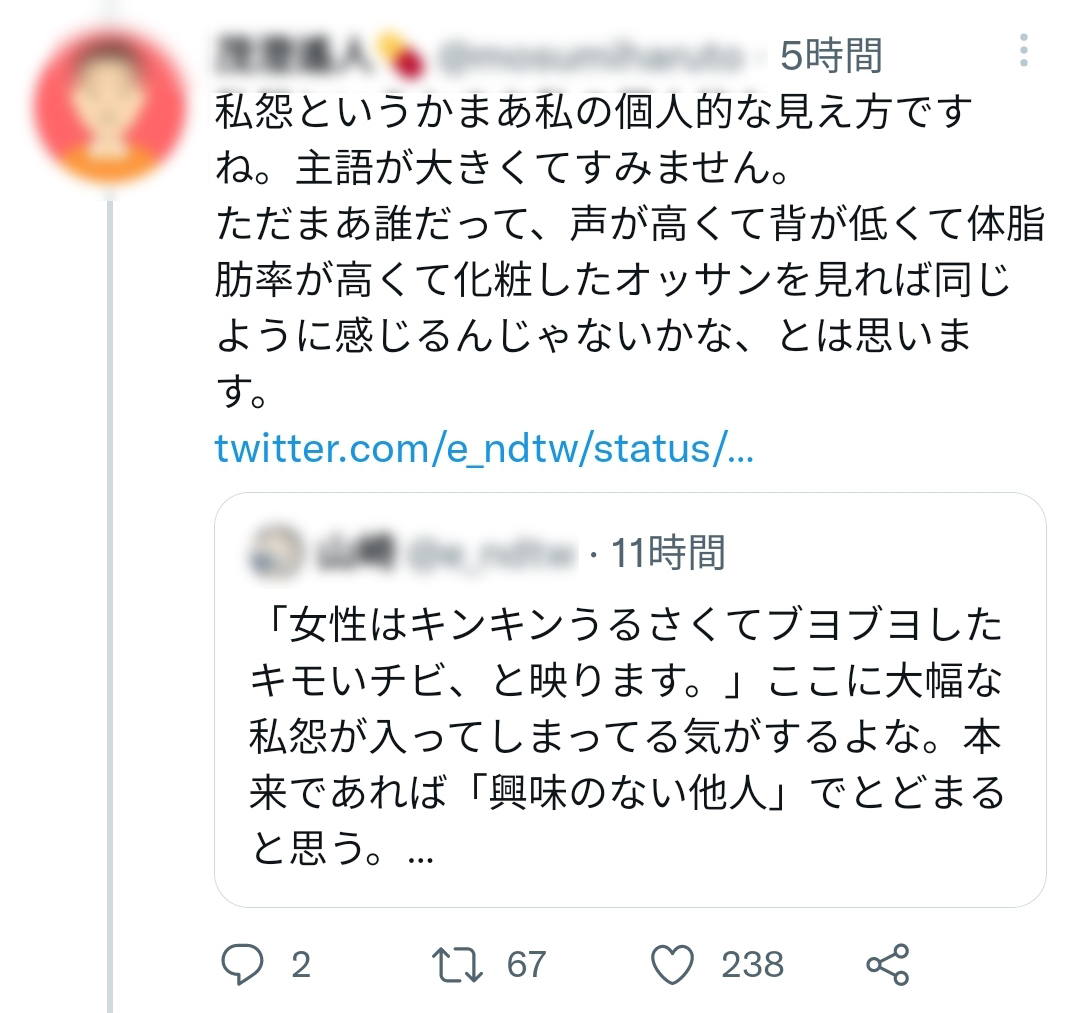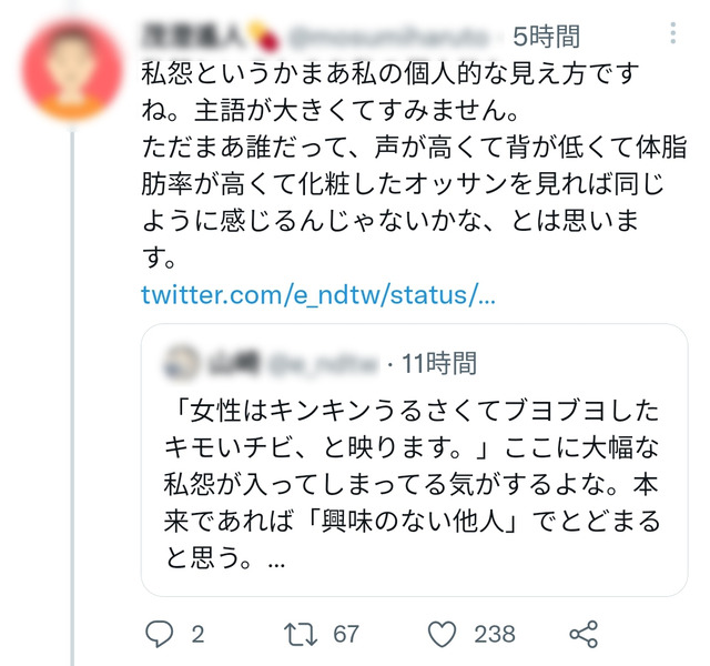 で、性欲による曇りが晴れた目には、女性はキンキンうるさくてブヨブヨしたキモいチビ、と映ります。正直おすすめはできません。 https://t.co/83u6eOABId— 茂澄遙人?? (@mosumiharuto) November 5, 2022