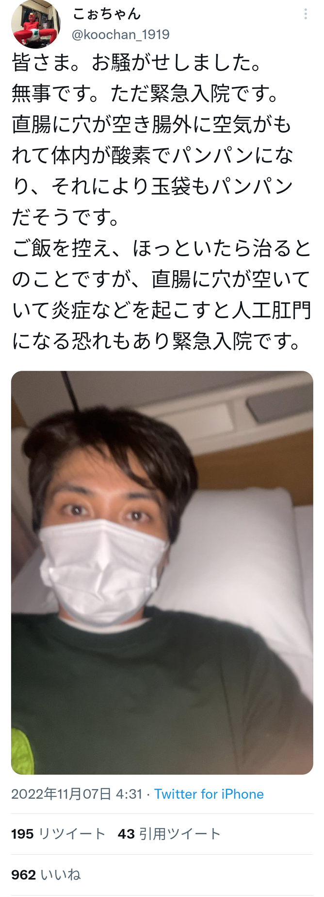 配信で『肛門から空気を入れて屁をせず腹筋50回に挑戦』企画をし、何度も空気を注入。腹筋50回はなんとか成功したものの、終了後に片玉が腫れだし複数の病院に電話するも専門性が高いと断られる。ついに救急車を呼ぶはめに pic.twitter.com/BHUHPFWlLJ— ∋星屑JET∈ (@hkz_jet) November 6, 2022