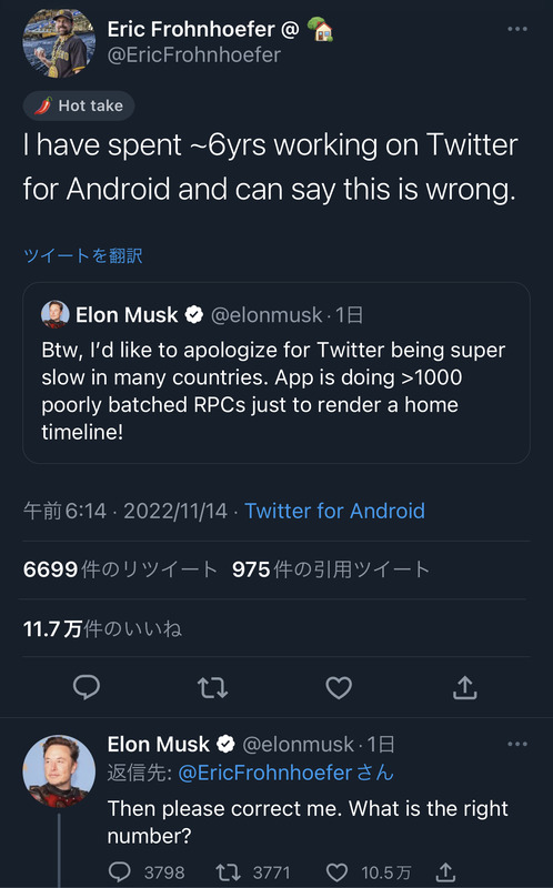 マスク「1000以上のサーバーコールがあるせいでAndroid版Twitterはタイムラインの表示さえクソ重い」