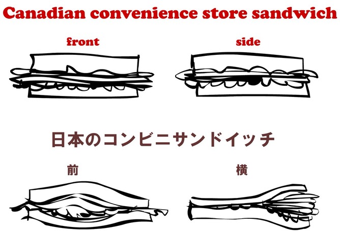コンビニに売られているサンドイッチの断面をパッケージ前面からと横からの図で紹介し、サンドイッチの具がパッケージ前面に寄せられてパッケージから見えない部分には具が少ないと示しており、この投稿には13万以上の「いいね」を集った。