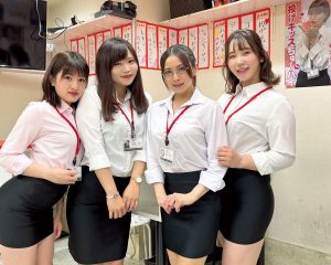 店内は、サラリーマンのグループから女性一人客まで、さまざまな顔ぶれ。一般世間との垣根など、もはやないのかもしれない。左から順に、春日えな、宮名遥、優木なお、弘前綾香