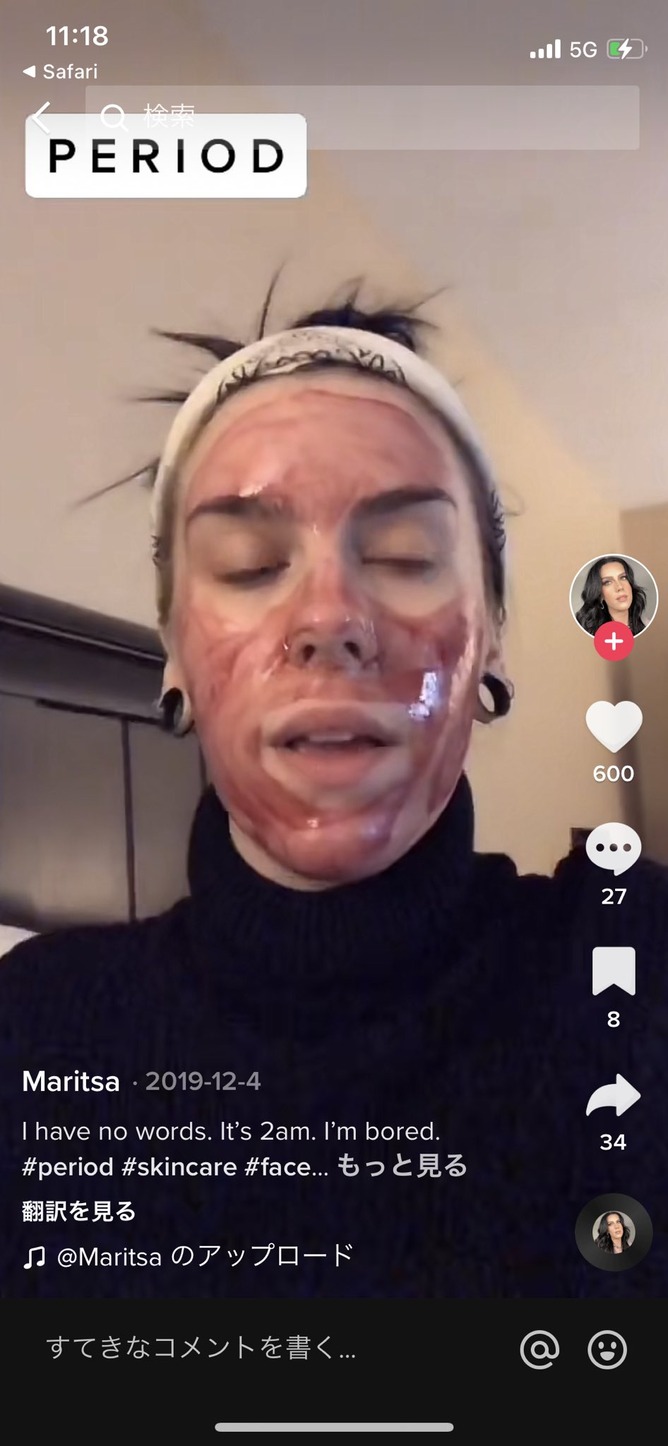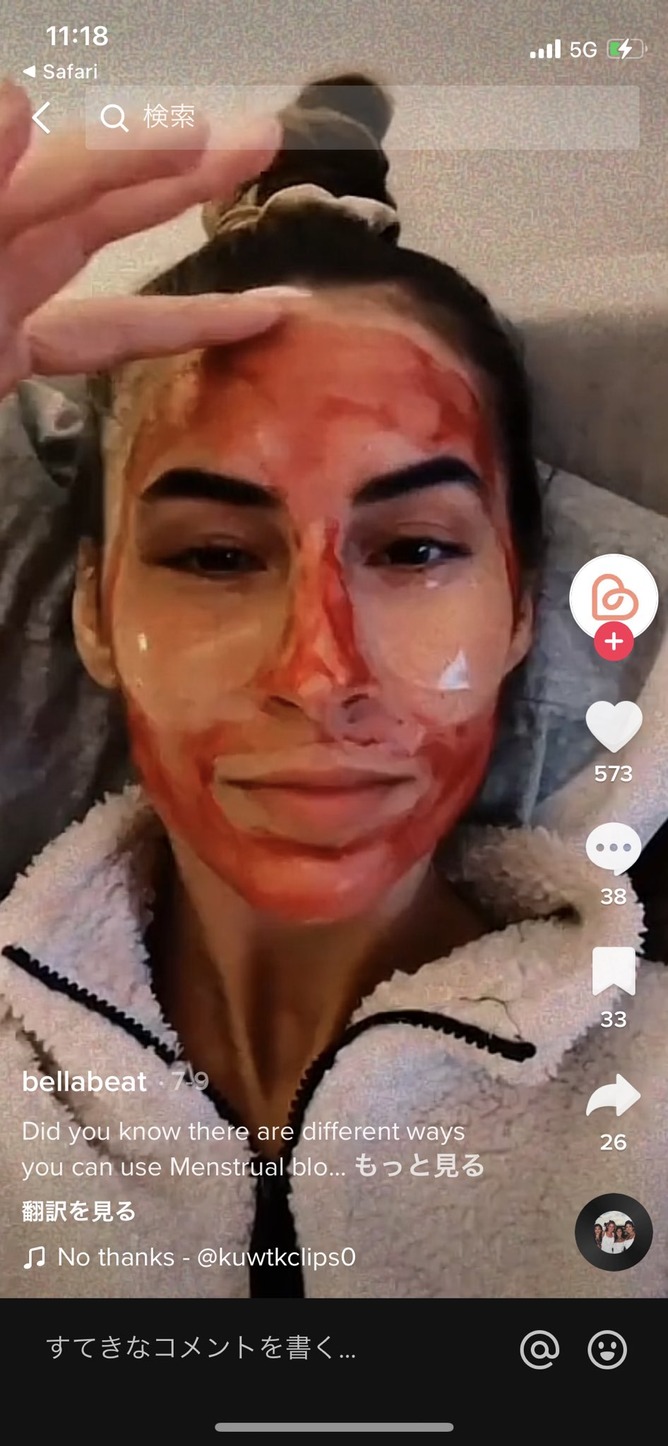 “経血マスク”を実践している女性は「フェイスマスクの新潮流」「生理の血を顔に塗ることで肌にいい効果を期待できる」「本当におすすめ!」と体験をシェアしている。