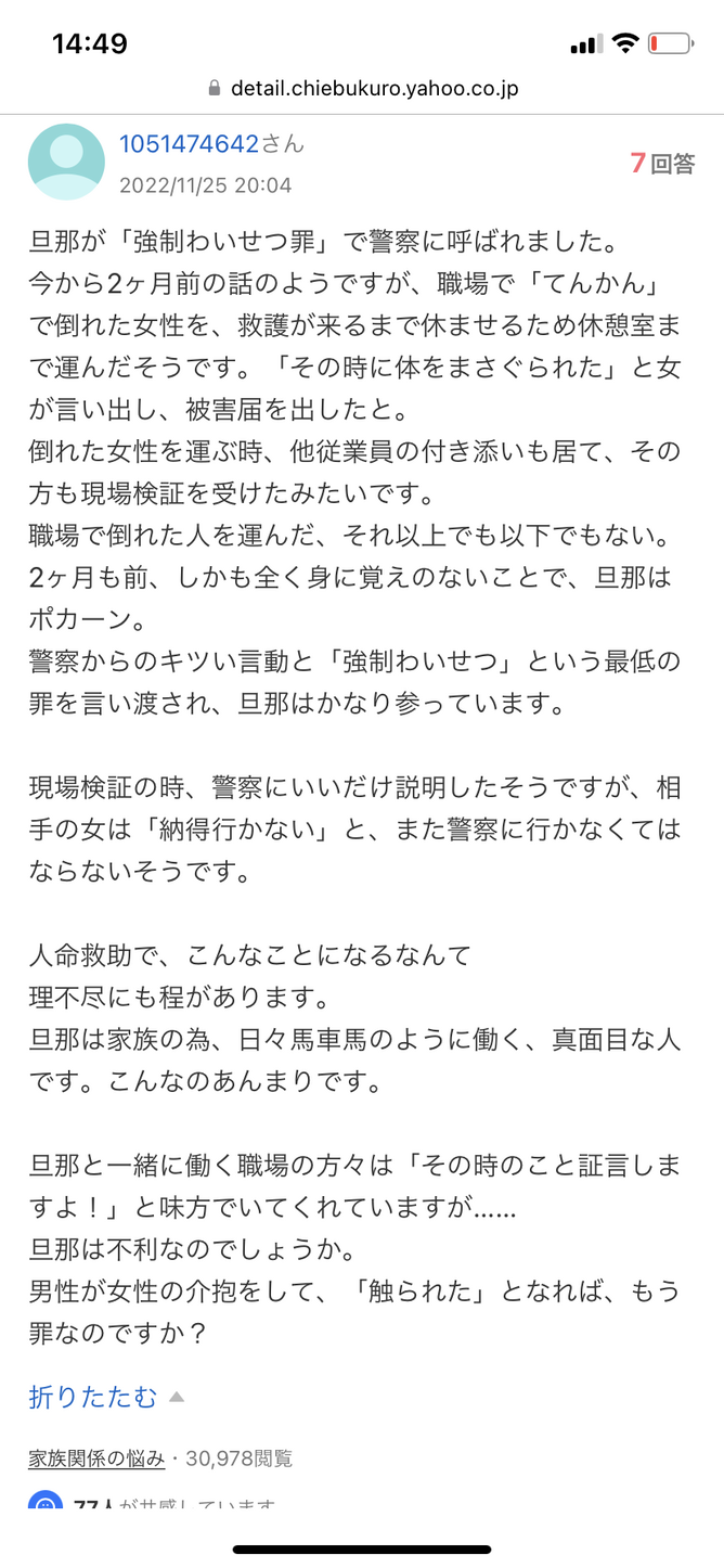 旦那が「強制わいせつ罪」で警察に呼ばれました。 今から2ヶ月前の話のようですが、職場で「てんかん」で倒れた女性を、救護が来るまで休ませるため休憩室まで運んだそうです。「その時に体をまさぐられた」と女が言い出し、被害届を出したと。