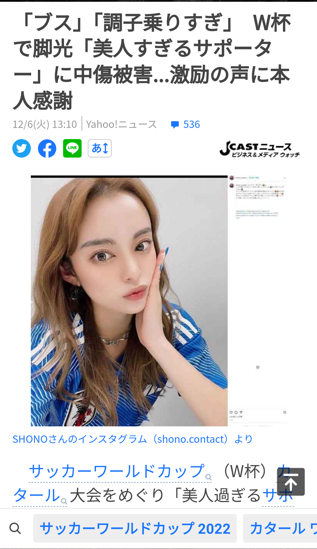 W杯グループステージの日本対ドイツ戦の国際映像に映ったことで、「美人サポーター」「ワールドクラス美女」と話題になっていたSHONOさん。一躍ブレークし、テレビなどのメディアにも多く出演。日本が強豪国に次々勝利したことから、「勝利の女神」とも呼ばれていた。