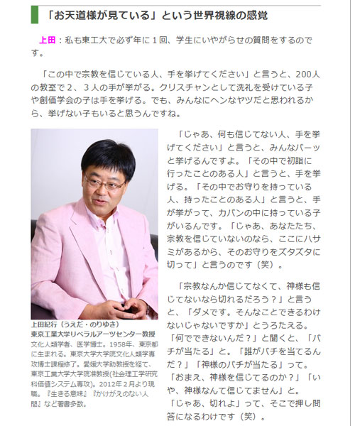 「宗教信じてないならお守りをズタズタに切って」 宗教学者と大学教授の対談が話題に|ガジェット通信 GetNews東洋経済オンライン掲載の山折哲雄と上田紀行の対談で、上田教授が無宗教と答える学生にお守りをハサミで切らせようとした実例が紹介され、ネットでは無宗教と無神論の違い、信仰と習俗の矛盾、屁理屈やカルト批判など多様な意見が交わされている。
