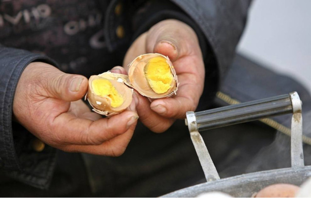 露天商が尿入りバケツを後日回収し、ヒビをいれた卵を1日茹で、皮を向いて新たな尿で二度茹でし完成となります。