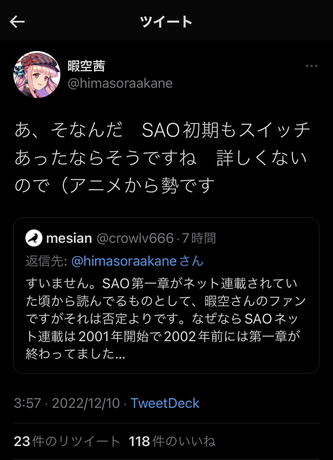 FF11という日本最初の大MMORPGにおいて、最初にクリアしたAposというプレイヤーが僕で、キリトのスイッチ戦法のモデルです。 https://t.co/vQOcjaPBSi— 暇空茜 (@himasoraakane) December 9, 2022