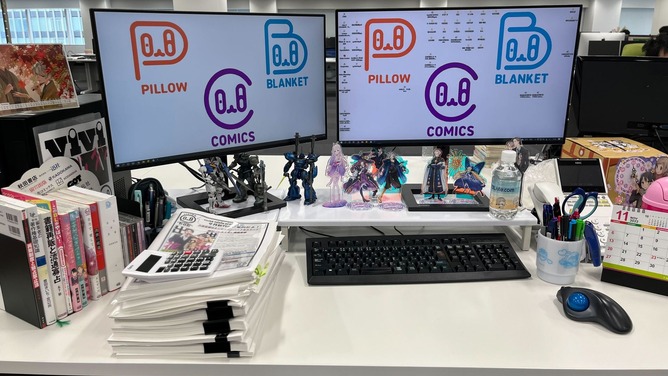 コンテンツ部で紙でのコミック出版に関わる業務をしています。自社コンテンツ作品・コミック・趣味のプラモデルを常に机に置いていつでも見れる状態にしています。“自社作品・趣味の愛にあふれる机にしたい”がコンセプトです。