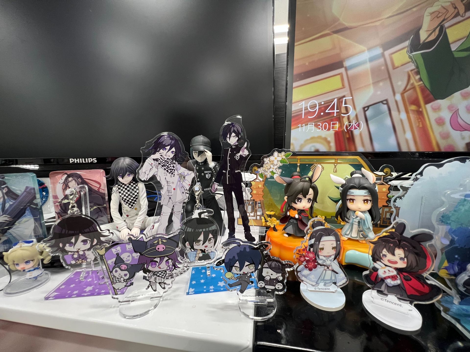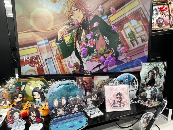 写真から伝わるように、いわゆる「祭壇」デスクです。 家に飾りきれないグッズや、常に見ていたいお気に入りのグッズを持ってきて飾っています。 最近はディスプレイボードも導入し、上にも飾れるスペースを確保しました!