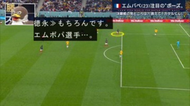 番組のW杯マスコットキャラのカタルくんから「さあ徳永さん、(この選手)もちろん知ってますよね」と聞かれると徳永アナは「もちろんです。エムボパ選手」と“珍解答”。出演者から「違う違う」と指摘され、顔を手で覆い恥ずかしそうな表情を浮かべた。