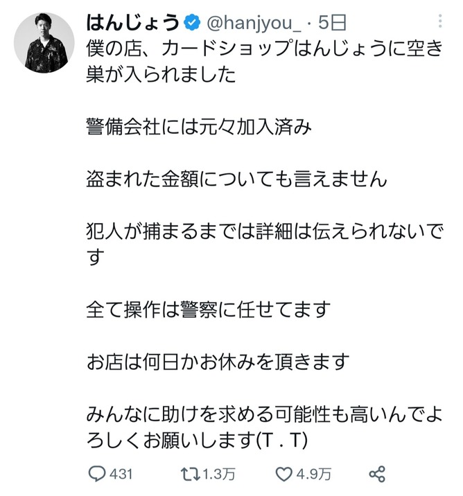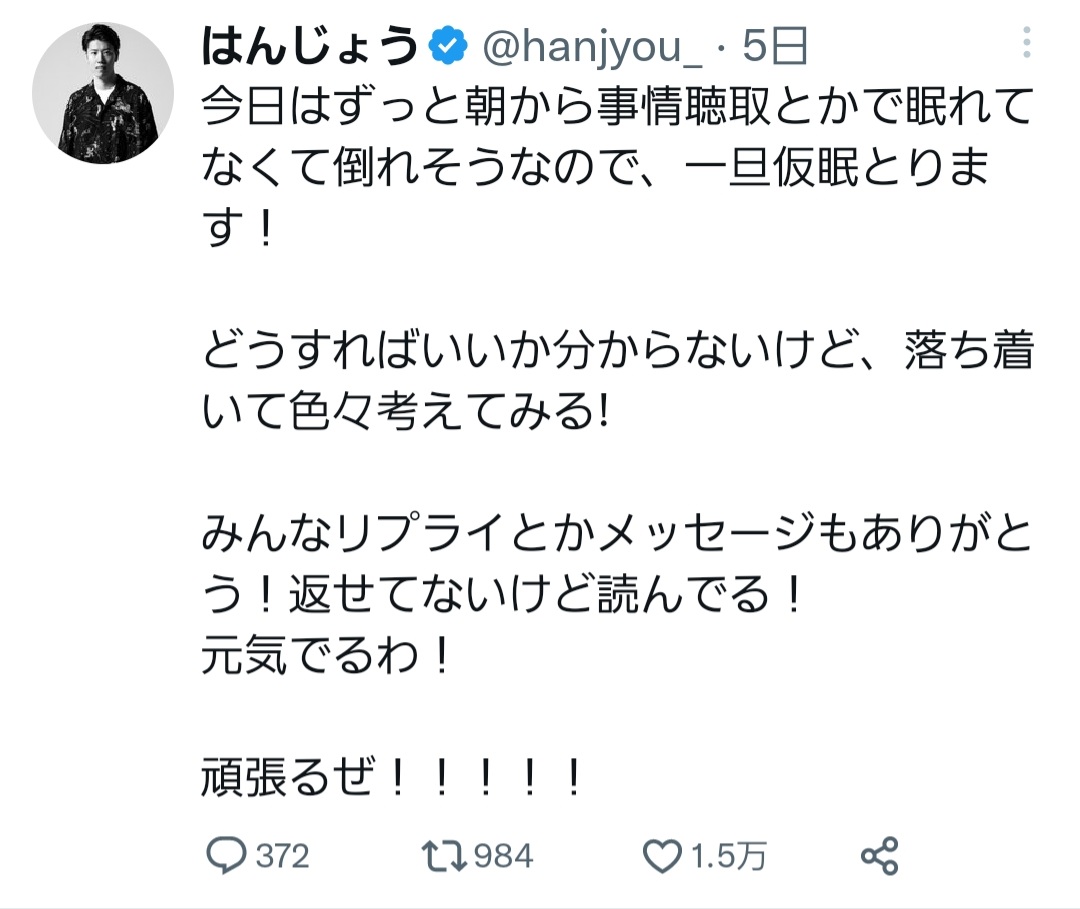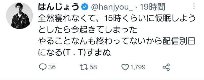 やることなんも終わってないから配信別日になる(T . T)すまぬ— はんじょう (@hanjyou_) December 20, 2022