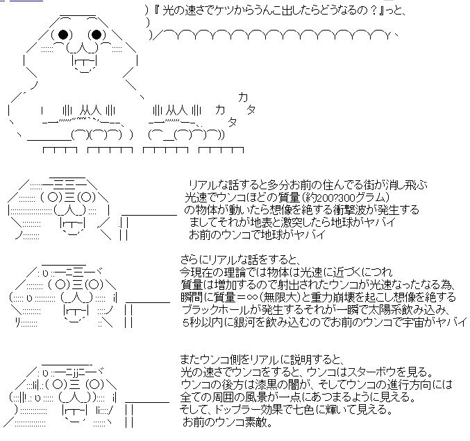 光の速さでケツからうんこ出したらどうなるの?【有名コピペが生まれたスレ!】 2022/12/30 不思議.net 1: 練習生(大阪府) 2007/04/07(土) 12:51:52.31 ID:KE08BO+y0 ツェペリみたいに飛べるの? 管理人です! 年末・年始は過去の名作や、おすすめ記事をお送りしています。 管理人です! 有名なコピペで『光の速さでケツからうんこ出したらどうなるの?』っていうのがありますが、それの元ネタとなったスレを見つけたのでまとめてみました! ↓これの元ネタになったスレですね。(クリックで拡大) ぼーうが一本あったとさーwwwwwwwwww【有名コピペが生まれたスレ】 http://world-fusigi.net/archives/9012968.html 続きを読む Source: 不思議.net