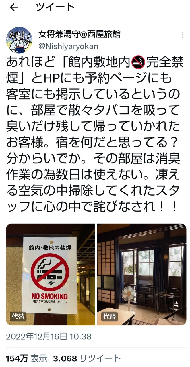 あれほど「館内敷地内🚭完全禁煙」とHPにも予約ページにも客室にも掲示しているというのに、部屋で散々タバコを吸って臭いだけ残して帰っていかれたお客様。宿を何だと思ってる?分からいでか。その部屋は消臭作業の為数日は使えない。凍える空気の中掃除してくれたスタッフに心の中で詫びなされ!! pic.twitter.com/4tGmmwtZke