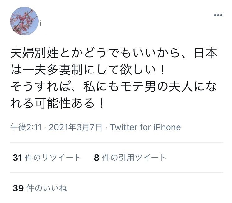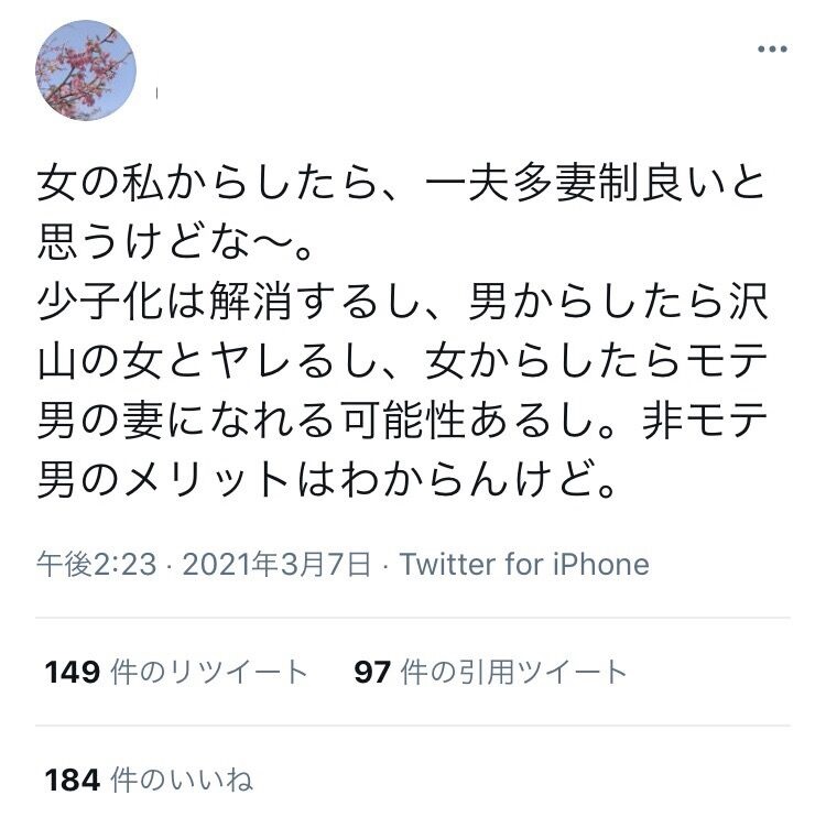 ツイッター女さん「いい加減一夫多妻制復活しろ!あたしはイケメンの100番目の妻とかでもいい!」