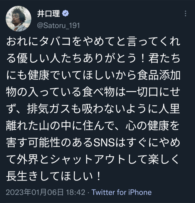 おれにタバコをやめてと言ってくれる優しい人たちありがとう!君たちにも健康でいてほしいから食品添加物の入っている食べ物は一切口にせず、排気ガスも吸わないように人里離れた山の中に住んで、心の健康を害す可能性のあるSNSはすぐにやめて外界とシャットアウトして楽しく長生きしてほしい!