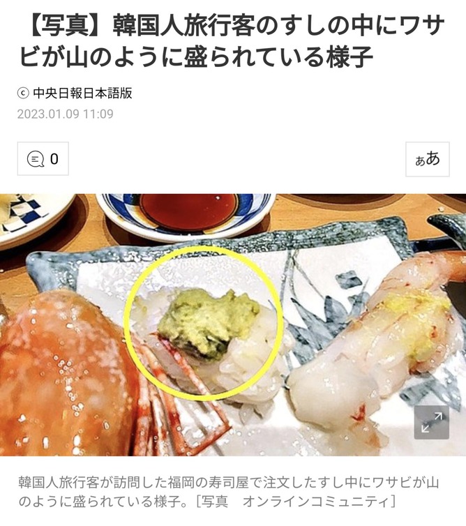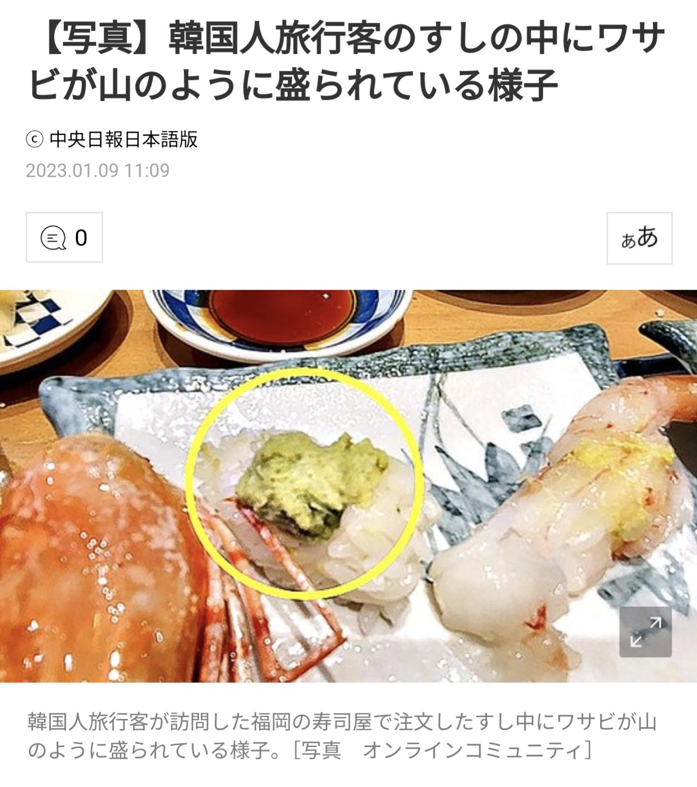 一方、日本寿司屋のワサビテ口は今回が初めてではない。昨年7月にも日本在住の韓国人女性が東京銀座の有名寿司屋を訪問してワサビテロにあったことが伝えられた。2016年大阪の有名すしチェーン店では韓国人客が注文したすしにワサビを必要以上にのせた後、客が食べにくそうにしている様子を店員が嘲弄して問題になった。当時この店は公式ホームページを通じて謝罪した。https://news.yahoo.co.jp/articles/b9ce0707e709fcc79bca850685c091c1ad3b3e60