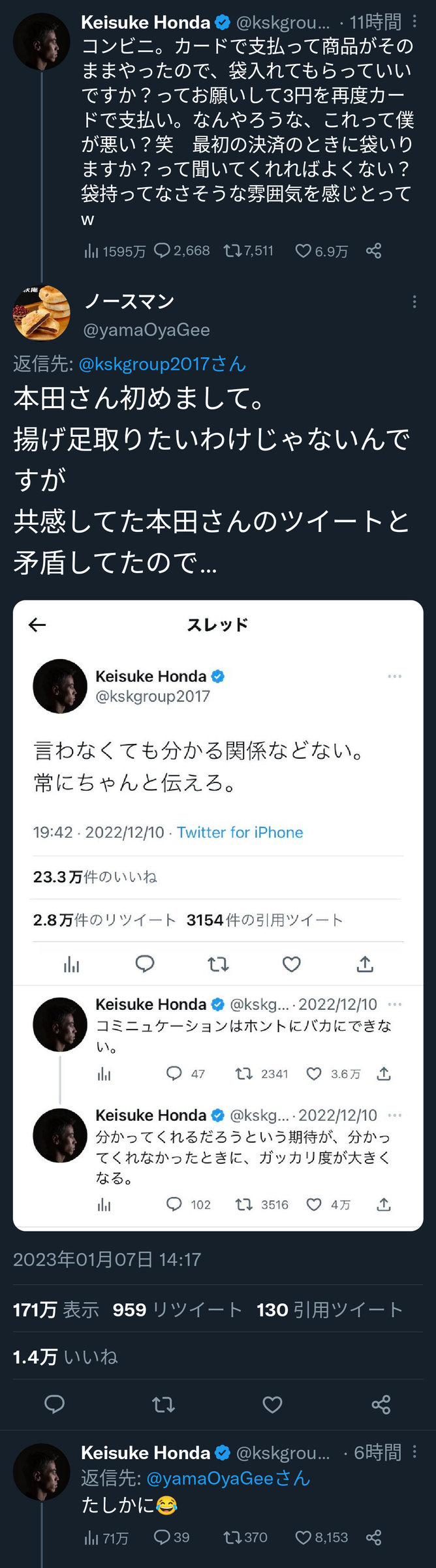 袋持ってなさそうな雰囲気を感じとってw— Keisuke Honda (@kskgroup2017) January 7, 2023