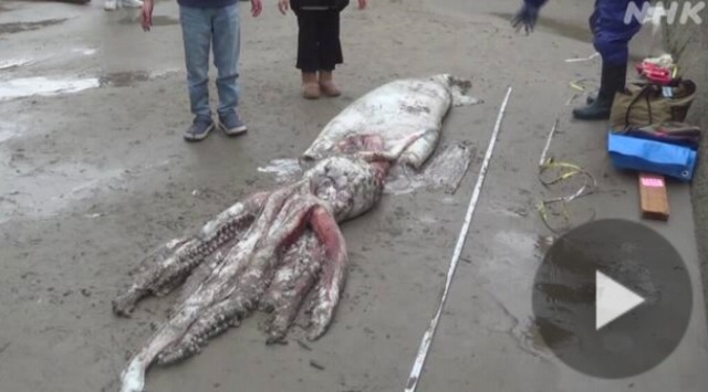 15日、鳥取県岩美町の海岸で体長3メートルを超えるダイオウイカが漂着しているのが見つかりました。
