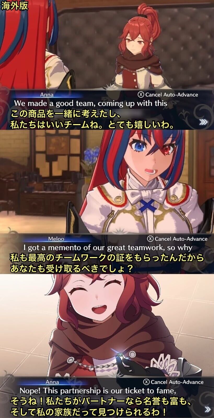 ・日本語版ではアンナが恋愛を匂わす表現を使っていたが、海外版では恋人というセリフは一切出てこない。