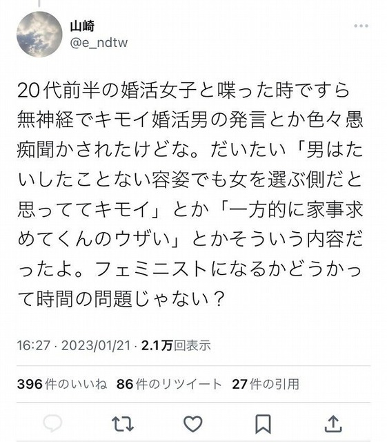だから別に婚活してる女子は無条件で男が好きなわけじゃないよ。みんなうっすら男が嫌いなんだから。 https://t.co/EPqjVRTwIe— 山崎 (@e_ndtw) January 22, 2023