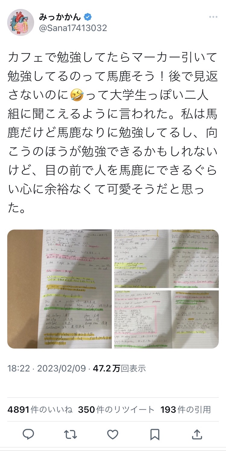 カフェで勉強してたらマーカー引いて勉強してるのって馬鹿そう!後で見返さないのに🤣って大学生っぽい二人組に聞こえるように言われた。私は馬鹿だけど馬鹿なりに勉強してるし、向こうのほうが勉強できるかもしれないけど、目の前で人を馬鹿にできるぐらい心に余裕なくて可愛そうだと思った。 pic.twitter.com/FH08ebWiX3