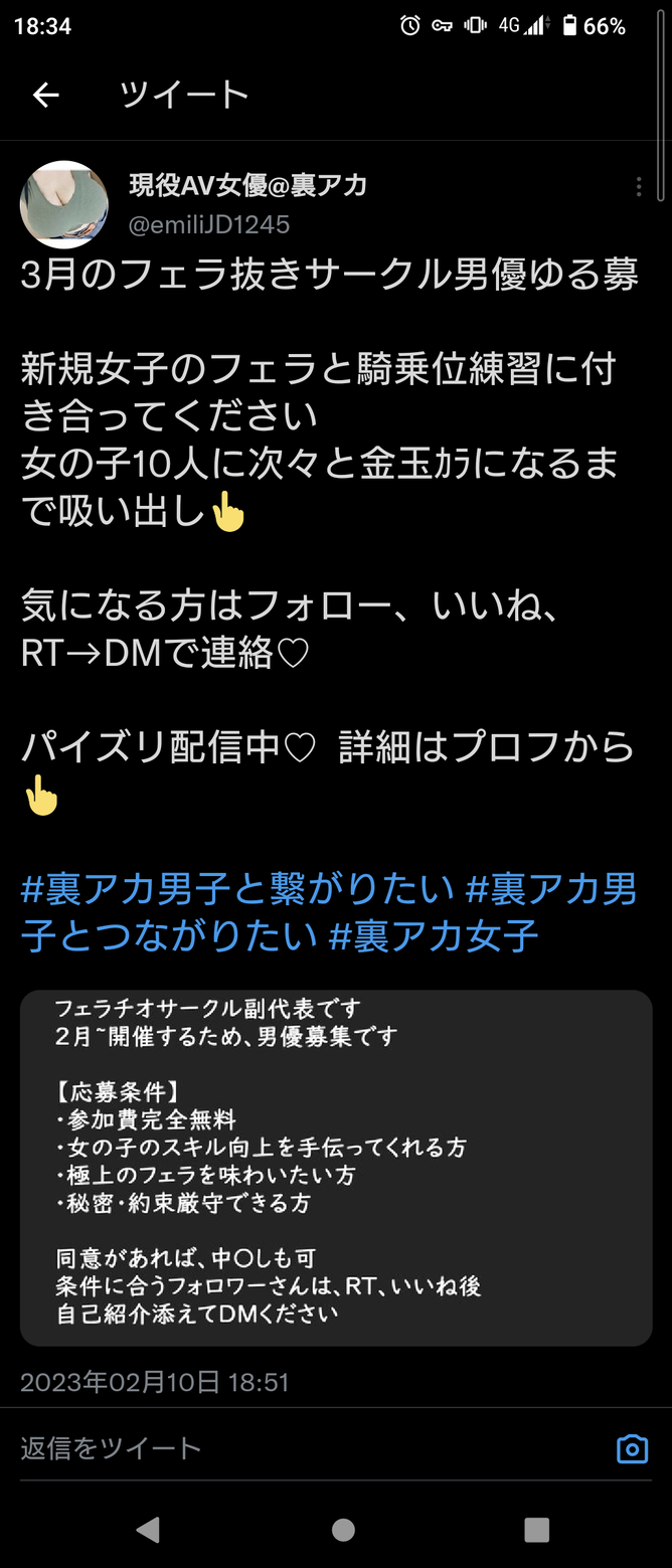 — 現役AV女優@裏アカ (@emiliJD1245) February 10, 2023