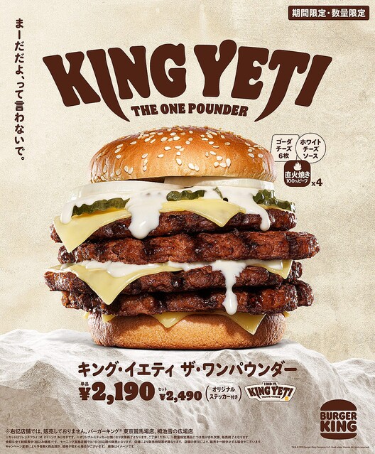 ハンバーガーチェーン「バーガーキング」(代表:野村一裕)の「チーズバーガー・ゲレンデ」シリーズから、総カロリー1495kcalという驚異のチーズバーガー「キング・イエティ ザ・ワンパウンダー」が登場。2月17日より発売される。