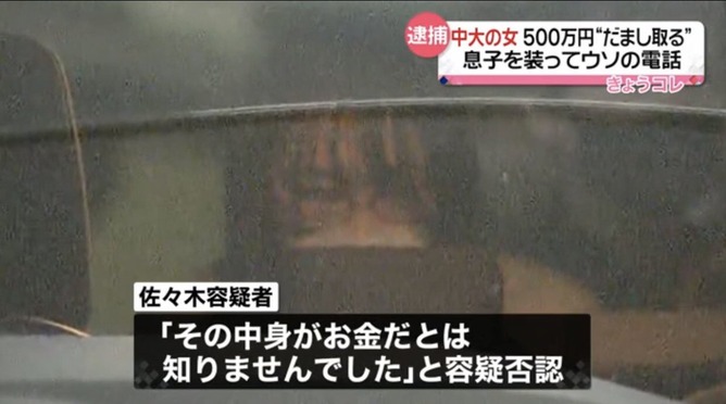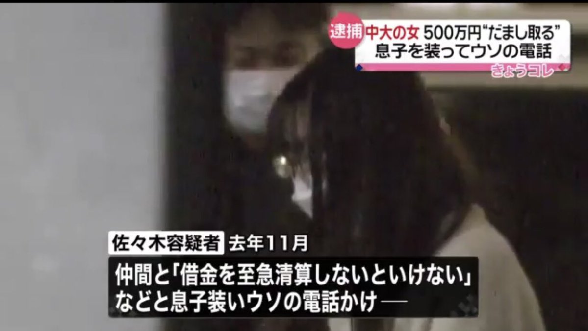 警察によりますと、中央大学文学部4年生の佐々木緋那容疑者は先月、仲間と共謀し「仕事の手続きのために現金を至急、必要としている」などと息子を装ってウソの電話をかけ、さいたま市に住む70代の女性から現金500万円をだまし取った疑いが持たれています。