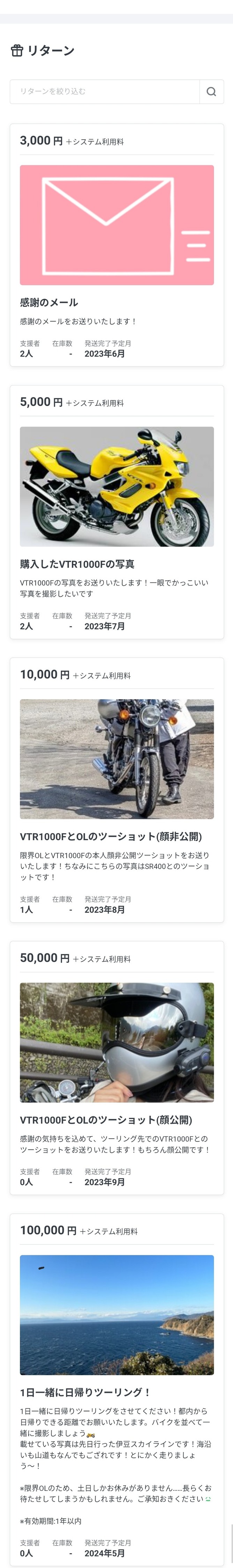 本プロジェクト最高額の10万円では「1日一緒に日帰りツーリング!」として、1年以内に都内から日帰りで行ける場所に支援者とツーリングに出かけるというものだった。