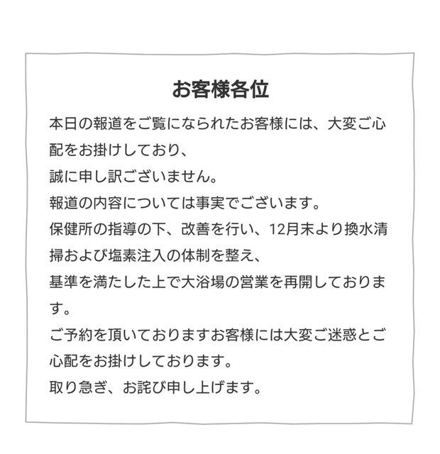 この際、旅館側は湯の交換頻度や塩素注入は適正だと説明した。さらにこの後、10月の自主検査でも菌は基準値以下だったと県に届け出た。