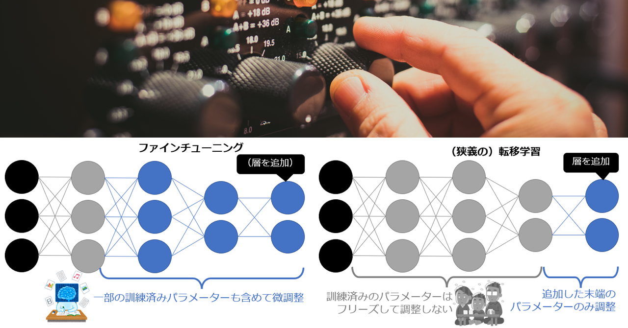機械学習(厳密にはニューラルネットワーク)におけるファインチューニング(Fine-tuning:微調整)とは、あるデータセットを使って事前学習(Pre-training)した訓練済みモデルの一部もしくは全体を、別のデータセットを使って再トレーニングすることで、新しいタスク向けに機械学習モデルのパラメーターを微調整することである
