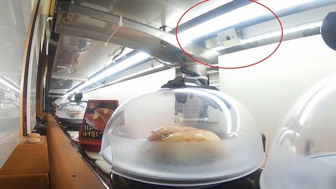 寿司が回っているレーンで、ふたが不自然に開閉されたり、客が不自然に皿を戻すなどの異常が発生すると、レーンに設置されているAIカメラが検知し、本部にある遠隔の監視システムに通報されます。